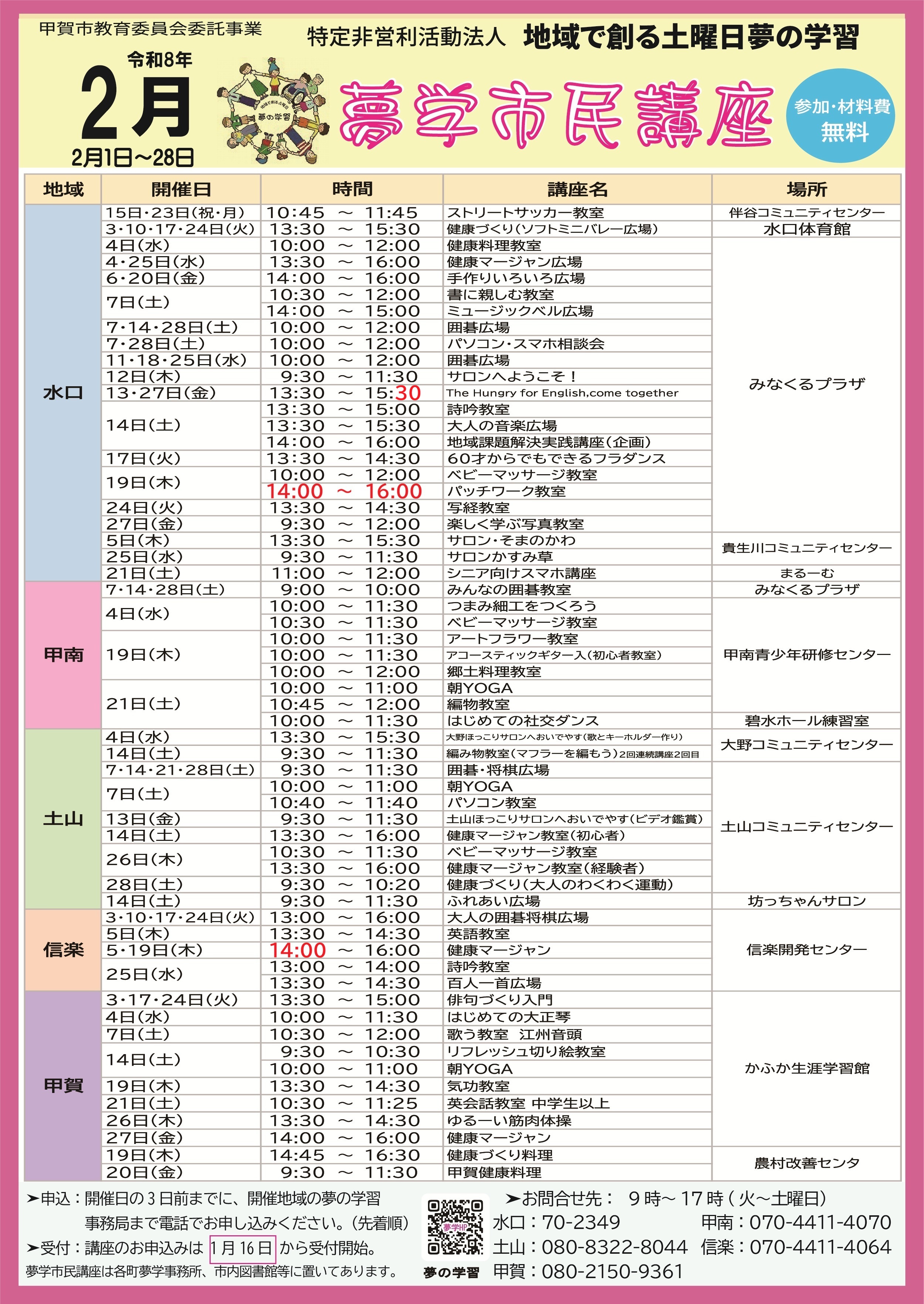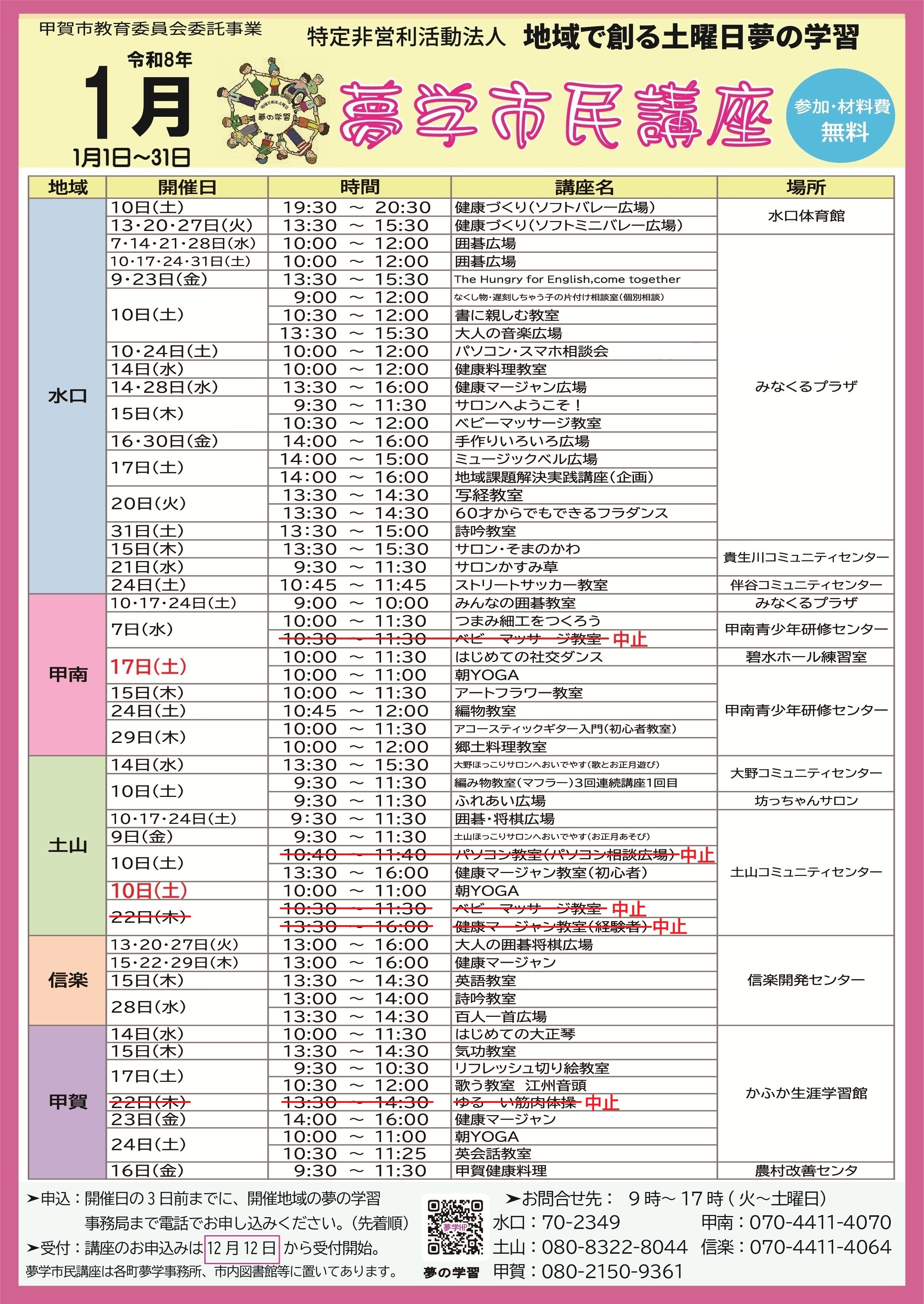 お申し込みはサークルスクエアまたは、開催地域の夢の学習事務局まで電話でお願いします。(先着順)
