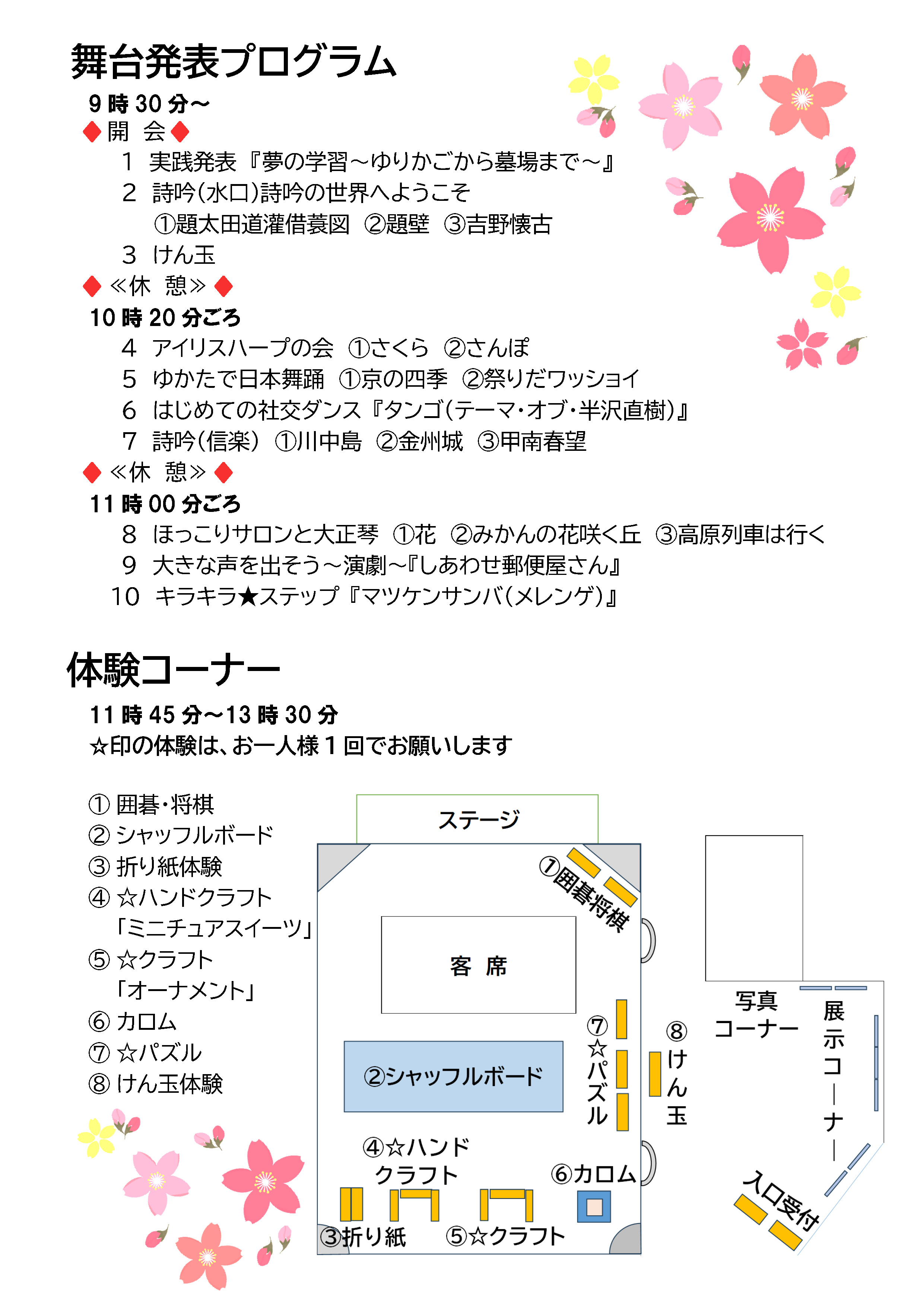 舞台発表終了後には無料で参加いただける体験コーナーを実施致します。